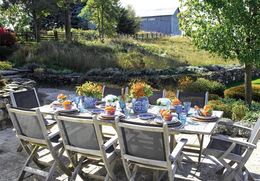Mismatched glassware, heirloom pumpkins, and potted herbs create a relaxed, countryside feel perfect for outdoor lunches or vineyard-style gatherings.