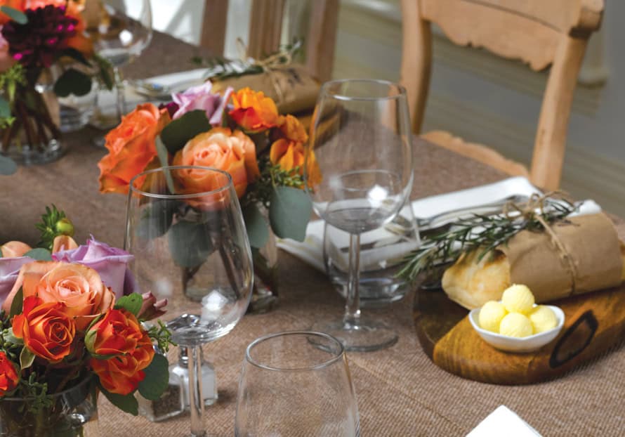 Wrapped baguettes with rosemary and name tags serve as take-home treats, adding warmth, texture, and function to each individual place setting.
