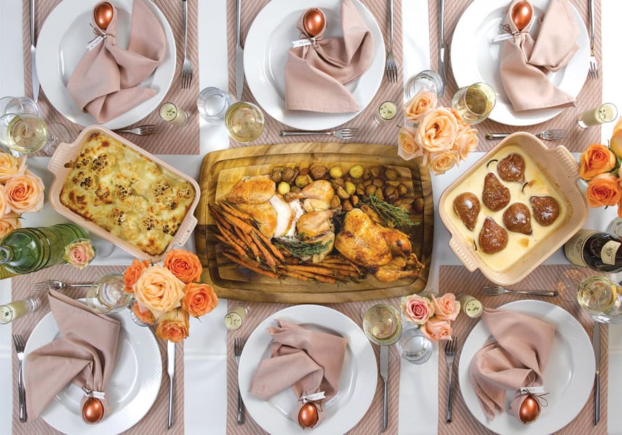 Family-style dishes anchor the table, surrounded by soft napkins, copper accents, and florals that echo the rich tones of the autumn harvest.