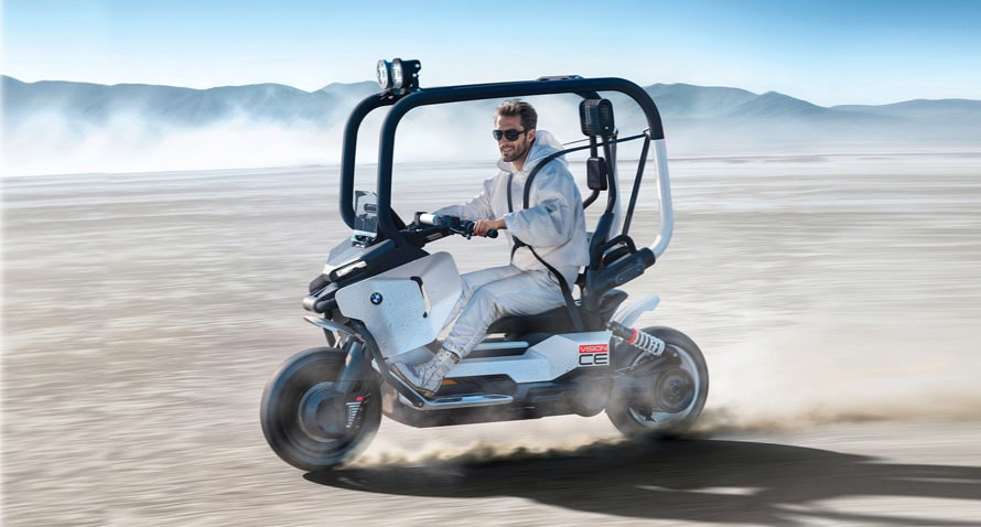 Leaving the need for protective helmets and clothing behind BMW’s Vision CE concept works with a metal tube, unique seat construction and seat belt.